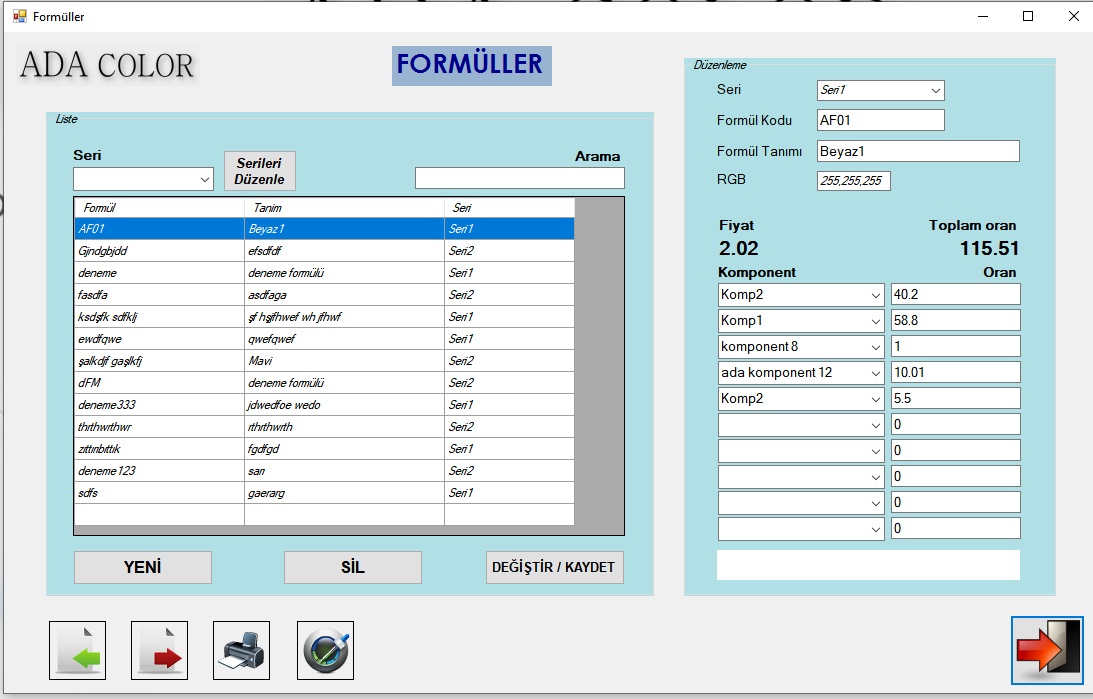 All formulas to be used in dispensing are stored in a database. Formulas entered into the database can be listed according to groups and formula type. All formulas belonging to the customer are transferred to the database in bulk or, when requested, the formulas in the database can be exported and reported in different formats.